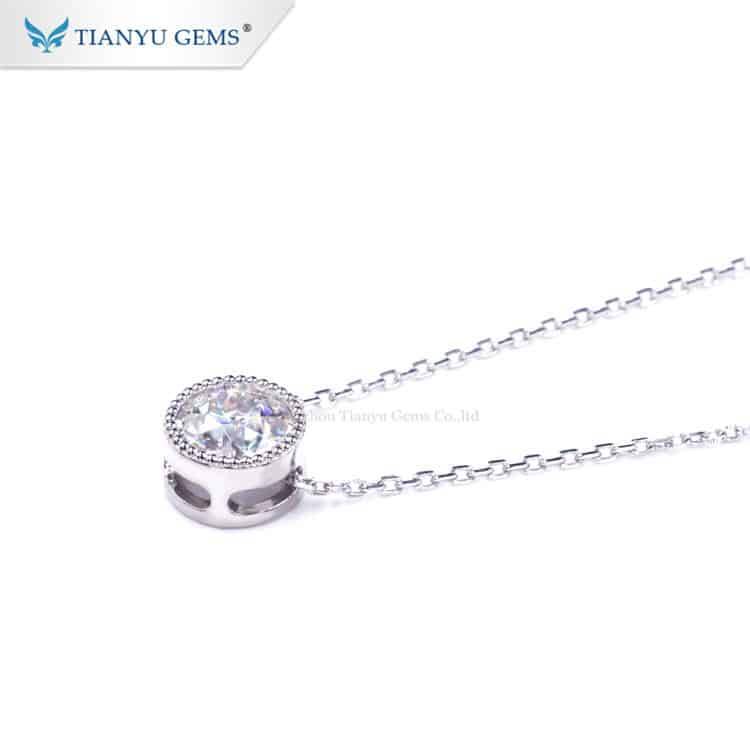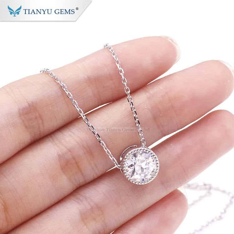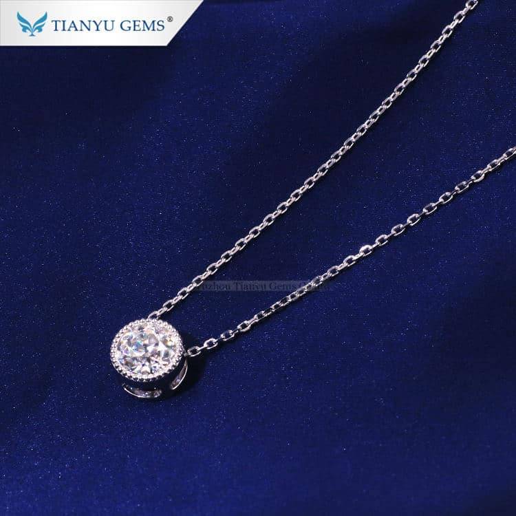 This necklace is made of Moissanite diamonds cut with the classic old European cut in (PT950) white gold, the main stone is surrounded by a silver bead, and the ring is open-worked in side view, hanging from an O-shaped chain.